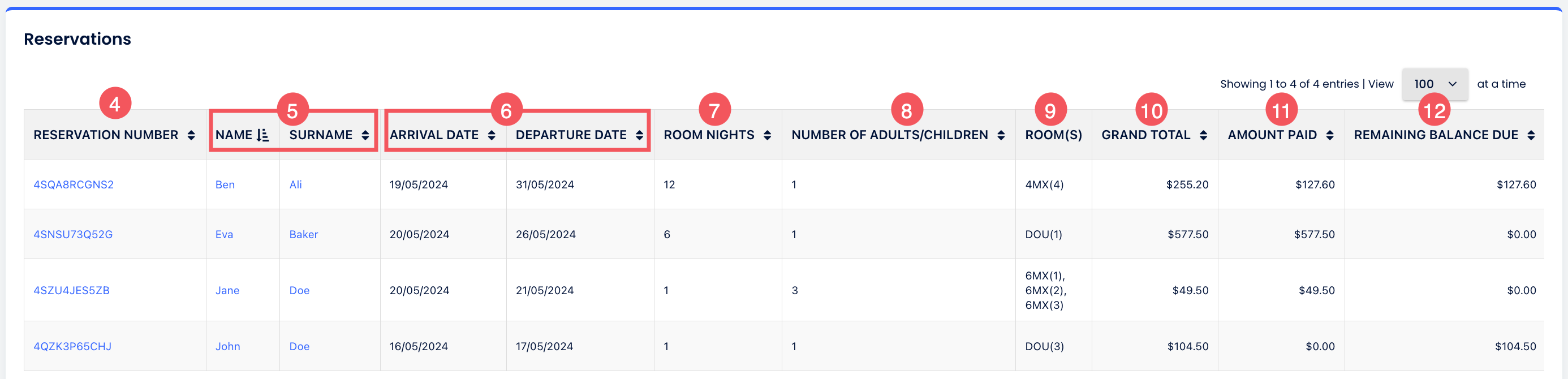Filtreleri uyguladıktan sonra, tablo aşağıdaki alanları içeren rezervasyon listesini gösterir: