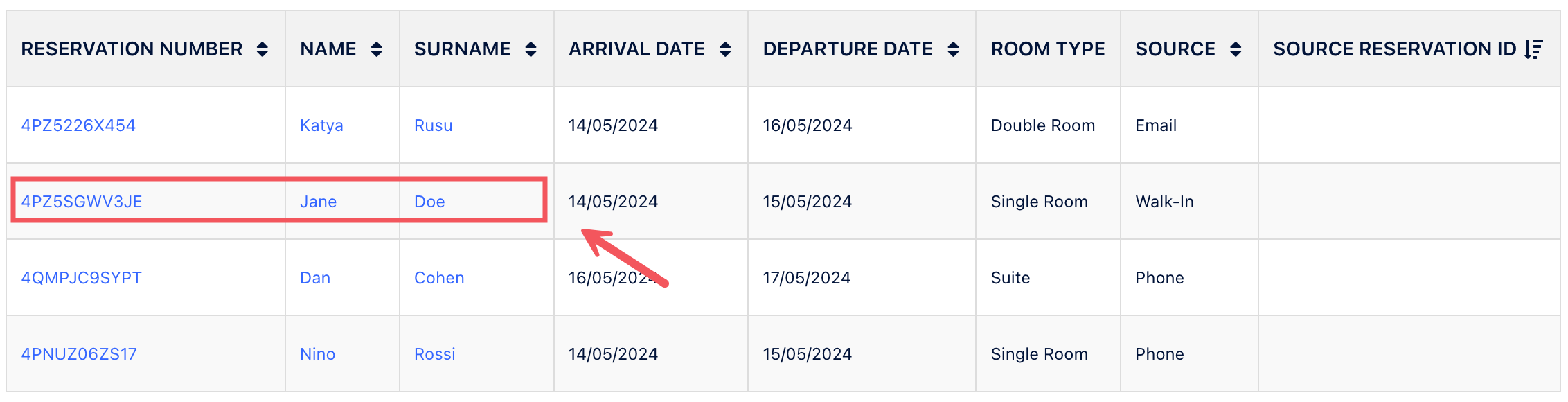 - Rezervasyon no, oda tipi veya isim ara: Rezervasyon numarası, oda tipi veya misafir ismi girerek belirli bir rezervasyonu görüntüle. Alanı boş bırakırsan tüm misafirlerinin tam listesini görebilirsin.