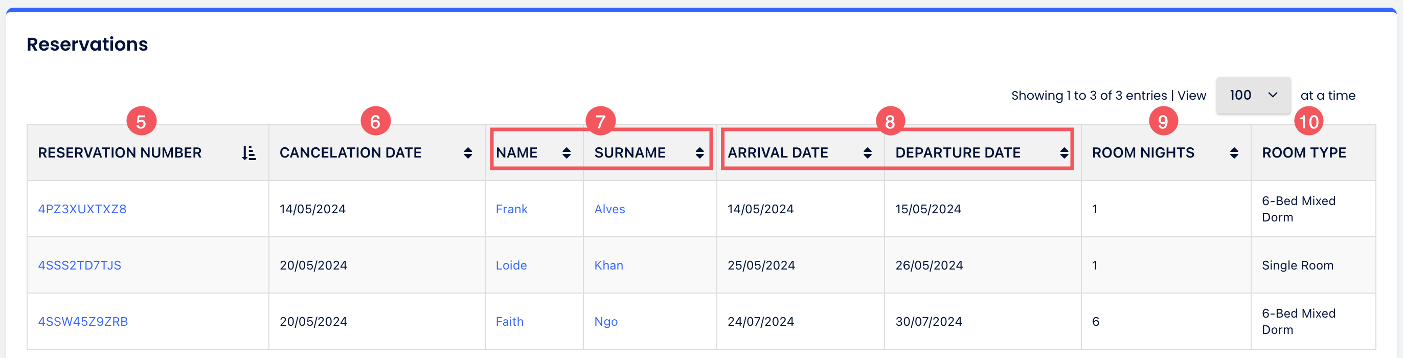 - Rezervasyon numarası, oda tipi veya isim ile ara: Rezervasyon numarası, oda tipi veya misafir ismini girerek belirli bir rezervasyonu görüntüle. Alanı boş bırakırsan tüm misafirlerinin tam listesini görebilirsin.