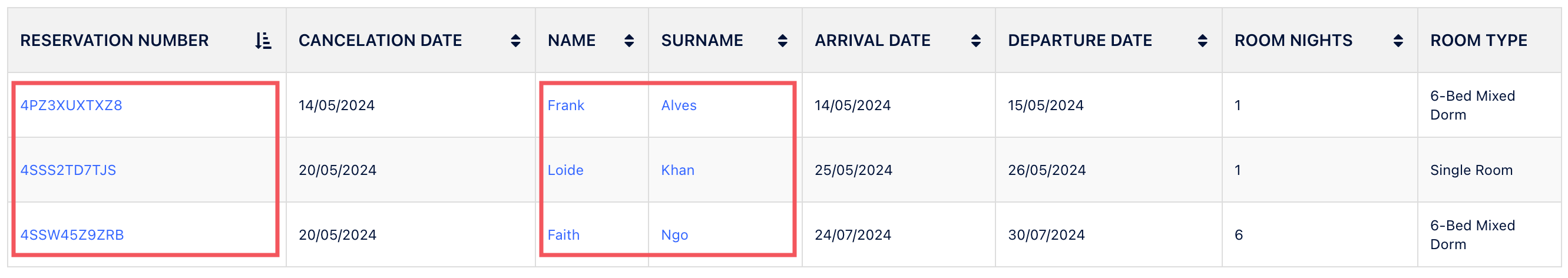 Filtreleri uyguladıktan sonra, tablo aşağıdaki alanları içeren rezervasyon listesini gösterir:
