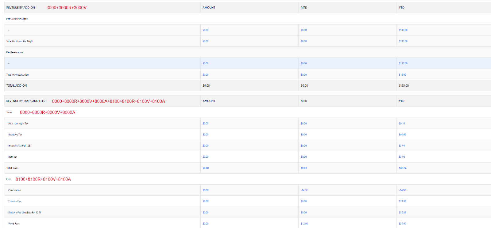 - Vergi ve Ücret Gelirleri: Oda fiyatları, öğeler vb. ile ilişkili toplam vergi ve ücretler.