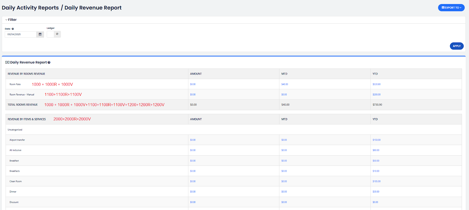 - Genel Toplam (Gelir): Seçilen tarihte misafir hesaplarına işlenen tüm gelir işlemlerinin toplamı.
