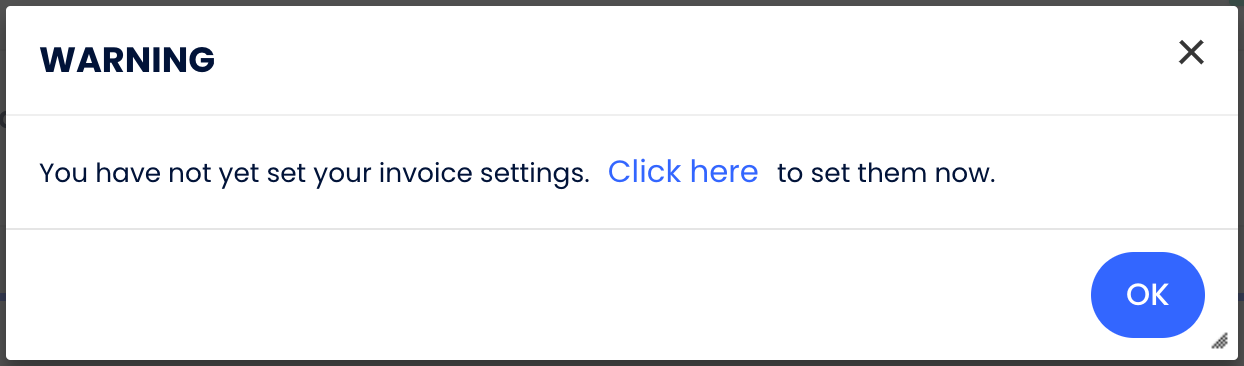 Bu, Grup faturaları oluşturmak için gerekli bir adımdır. Aksi takdirde, kullanıcı faturalandırma sayfasını ayarlamadan Oluştur veya Faturayı E-posta ile Gönder seçeneklerine tıklarsa, aşağıdaki uyarı mesajını görür.