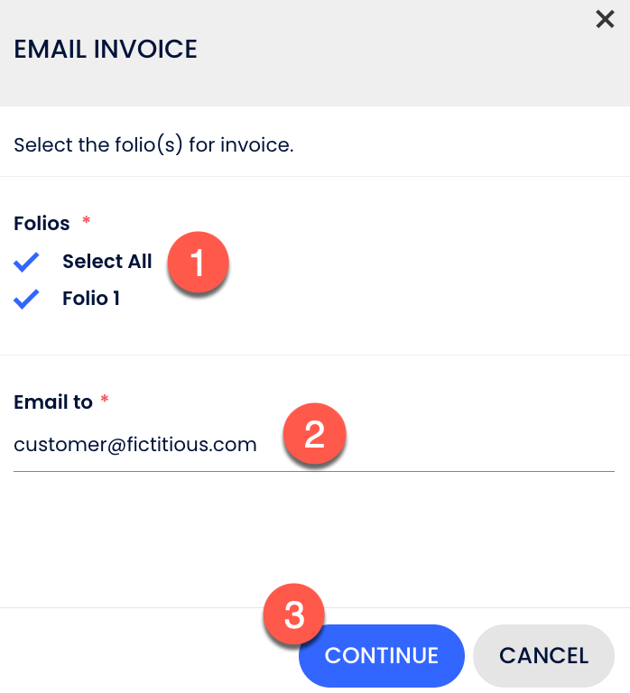 - E-posta ile Fatura Gönder seçeneğine tıkladığında, sistem sağda bir kasa açacak ve hangi folyo(lar)ı göndermek istediğini seçmeni ve misafir e-postalarını eklemeni sağlayacak