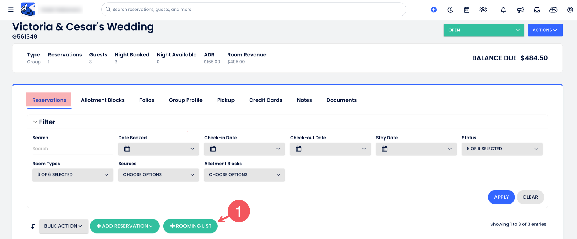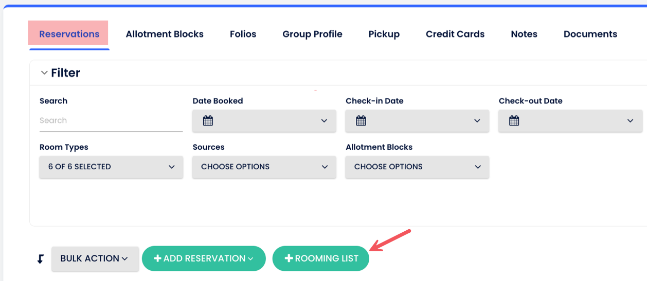 Bir Grup Profili Oluşturduktan sonra, mevcut Rezervasyonlarını gruba bağlamanın yanı sıra, onları baştan Oluşturabilir veya +Oda Dağılım Listesi aracını kullanabilirsin.