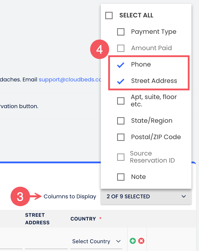 - Rezervasyonlar İçe Aktarma sayfasına geri dön, Sütunları Seç (etiketi “Görüntülenecek Sütunlar”) seçeneğine tıkla.