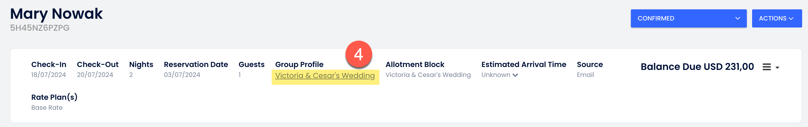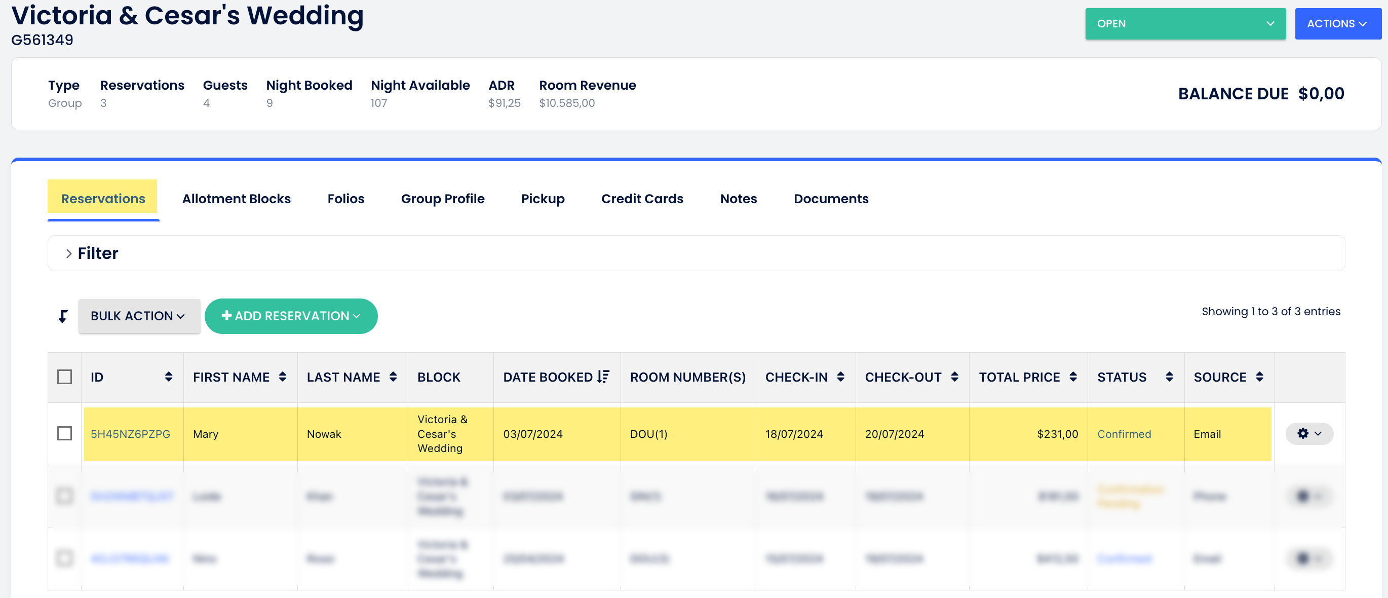 - Rezervasyon, Rezervasyonlar sekmesinde listede görünecek ve Grup Profilinin üst bilgi sayıları yeniden hesaplanacaktır.
