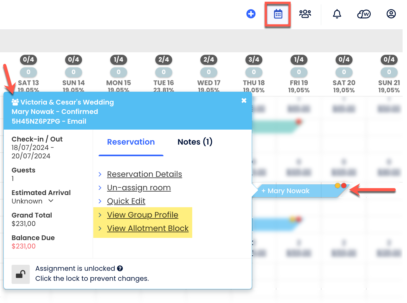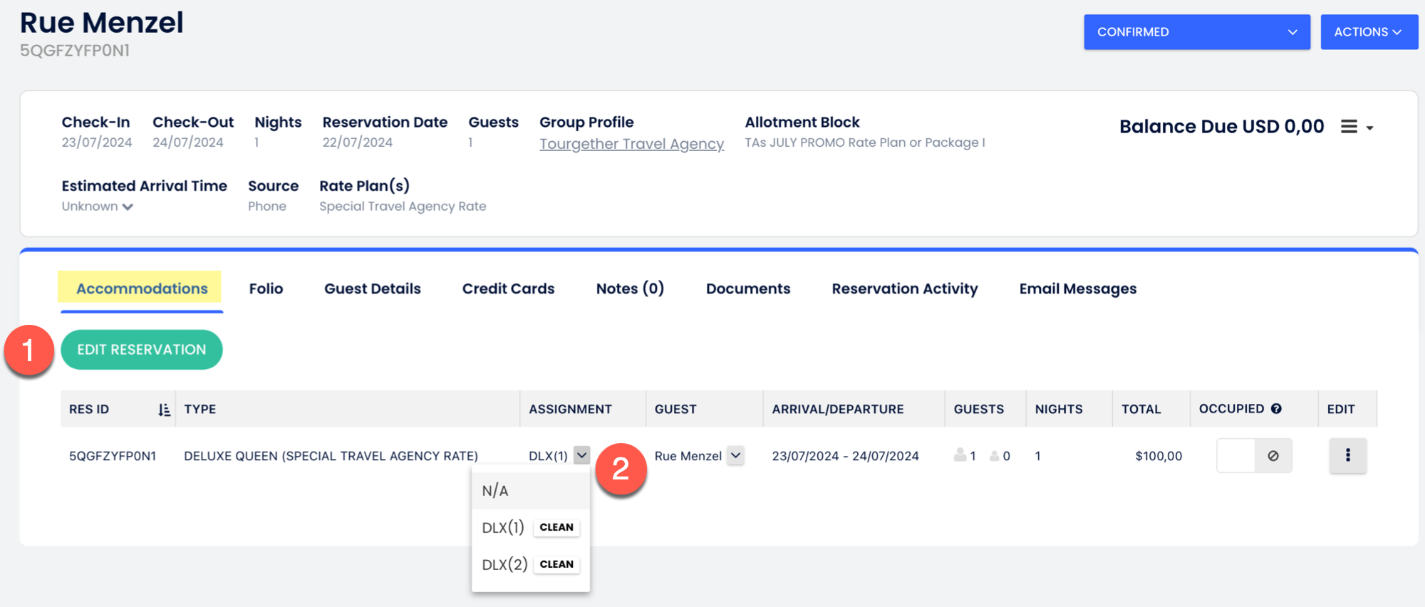 Öncelikle, Atama Bloğunu düzenle ve konaklama türü veya birimi ekle, ardından mevcut rezervasyonu istediğin odaya taşı.
