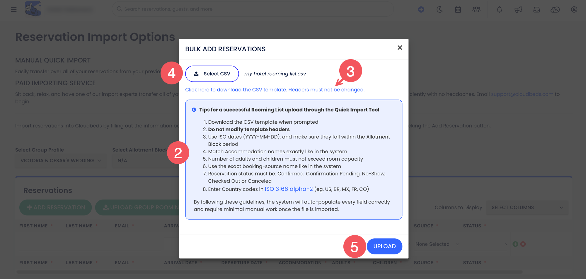 - Cloudbeds CSV şablonunu indir ve dosyanı hazırla.