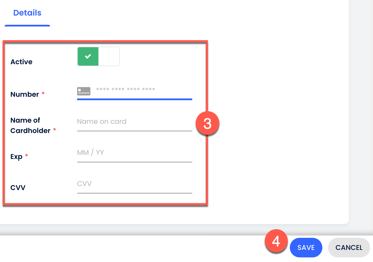 Kredi Kartları sekmesi altında, kredi kartını ekleyebilir ve ardından bu kartı Grup Folyosuna bir ücret veya iade eklerken ödeme yöntemi olarak seçebilirsin.
