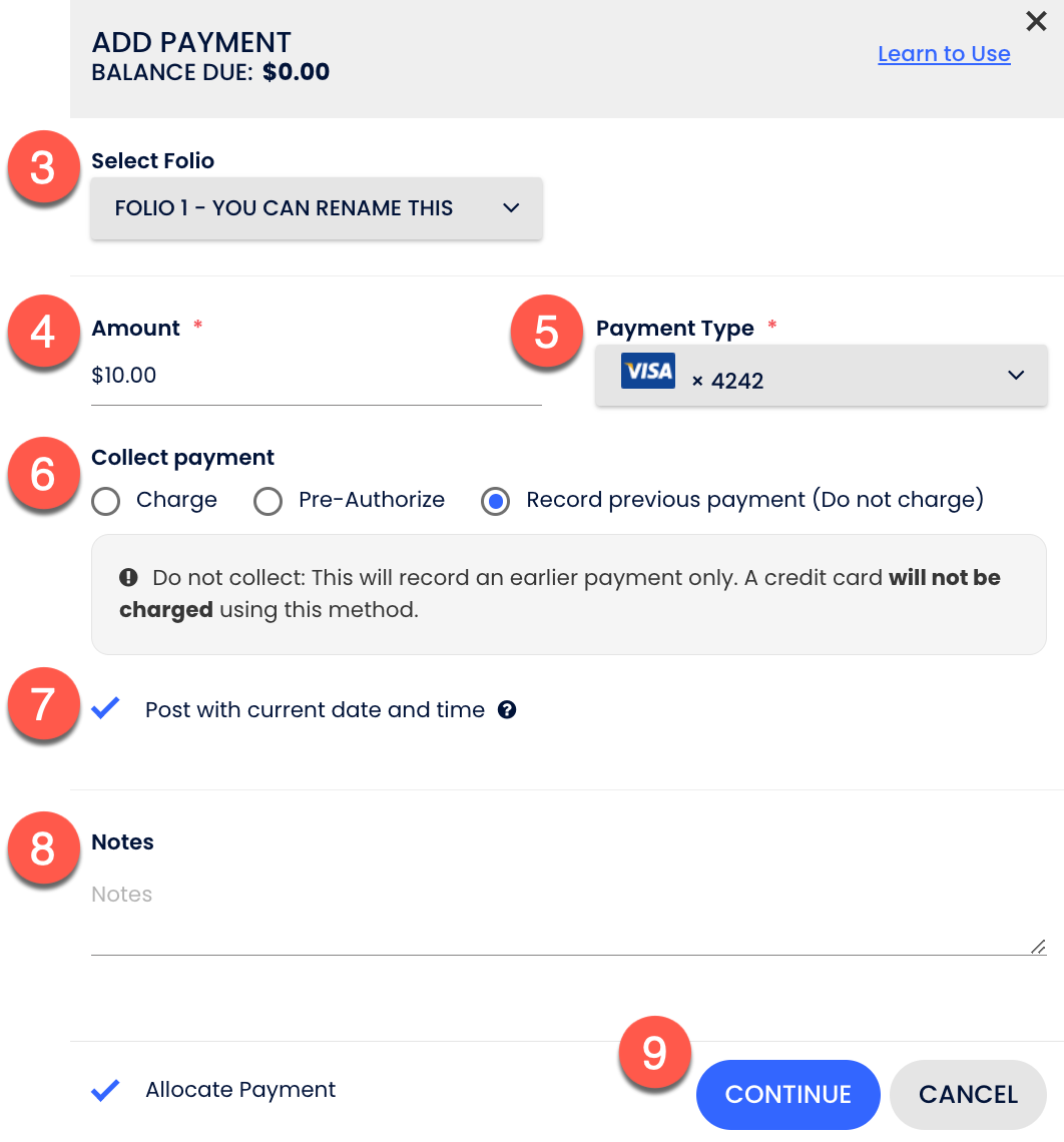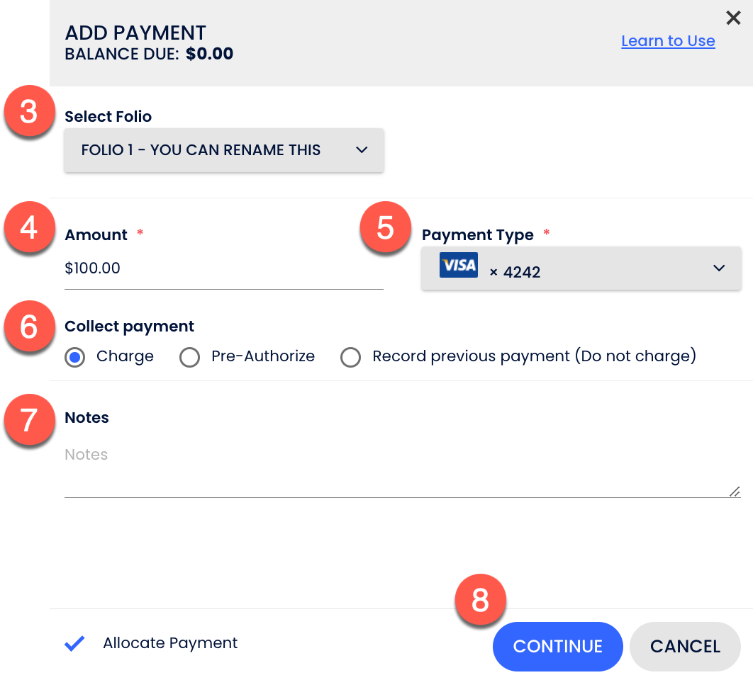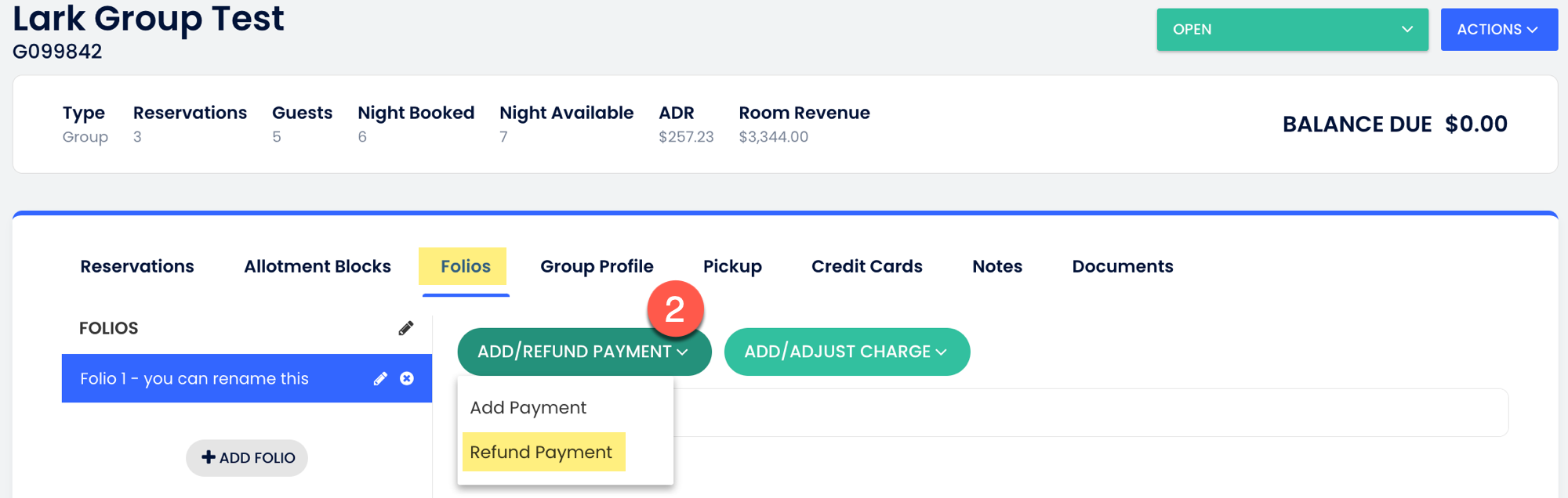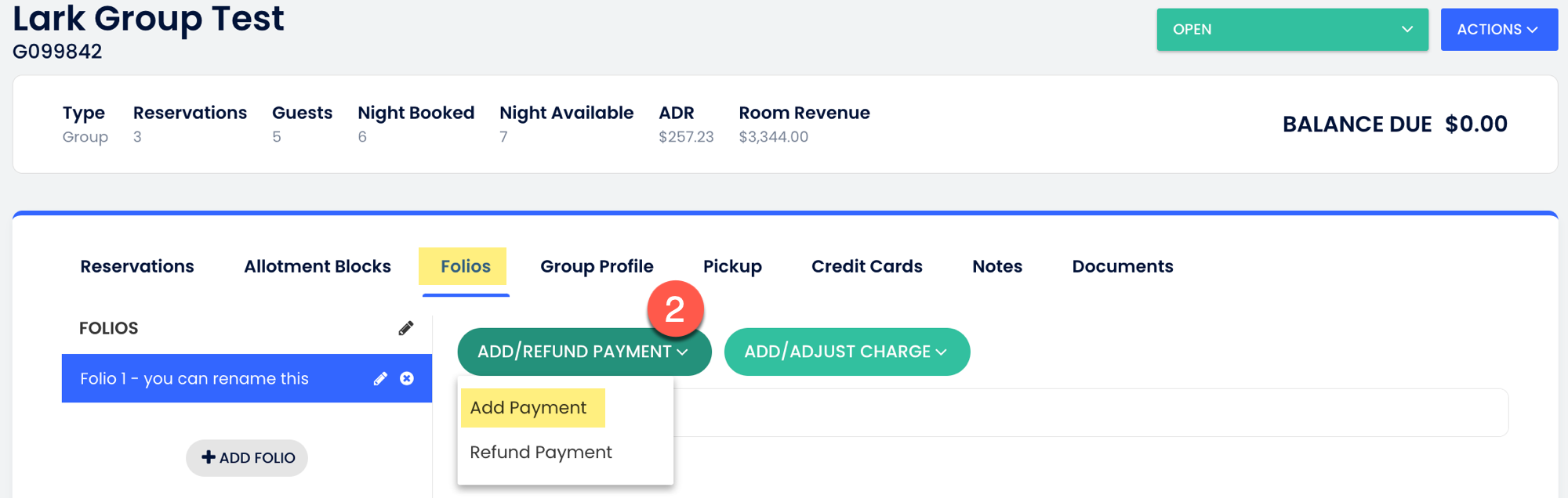 Ödeme Ekle işlemi, ödeme hareketini rezervasyonlara ekler ve eğer o işlem türü için yönlendirme ayarlanmışsa, ödemeyi otomatik olarak grup folyosuna yönlendirir.