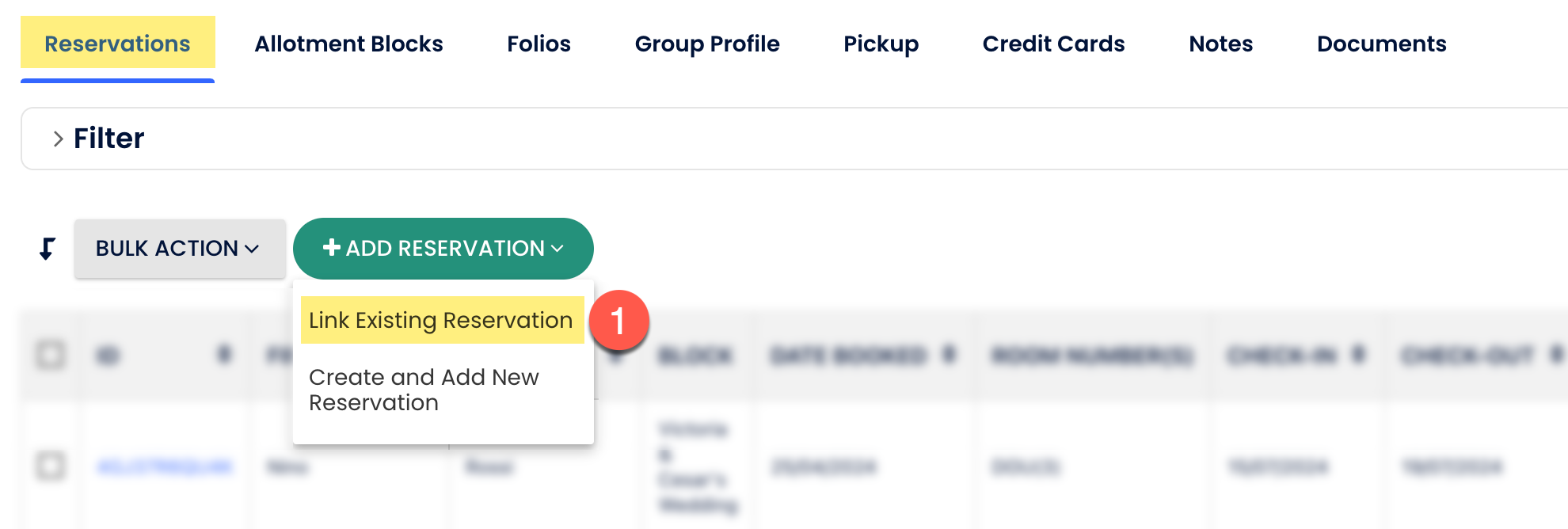 - İstediğin Grup profilinin Rezervasyonlar sekmesinden, +Rezervasyon Ekle seçeneğine tıkla ve Mevcut Rezervasyonu Bağla seç.