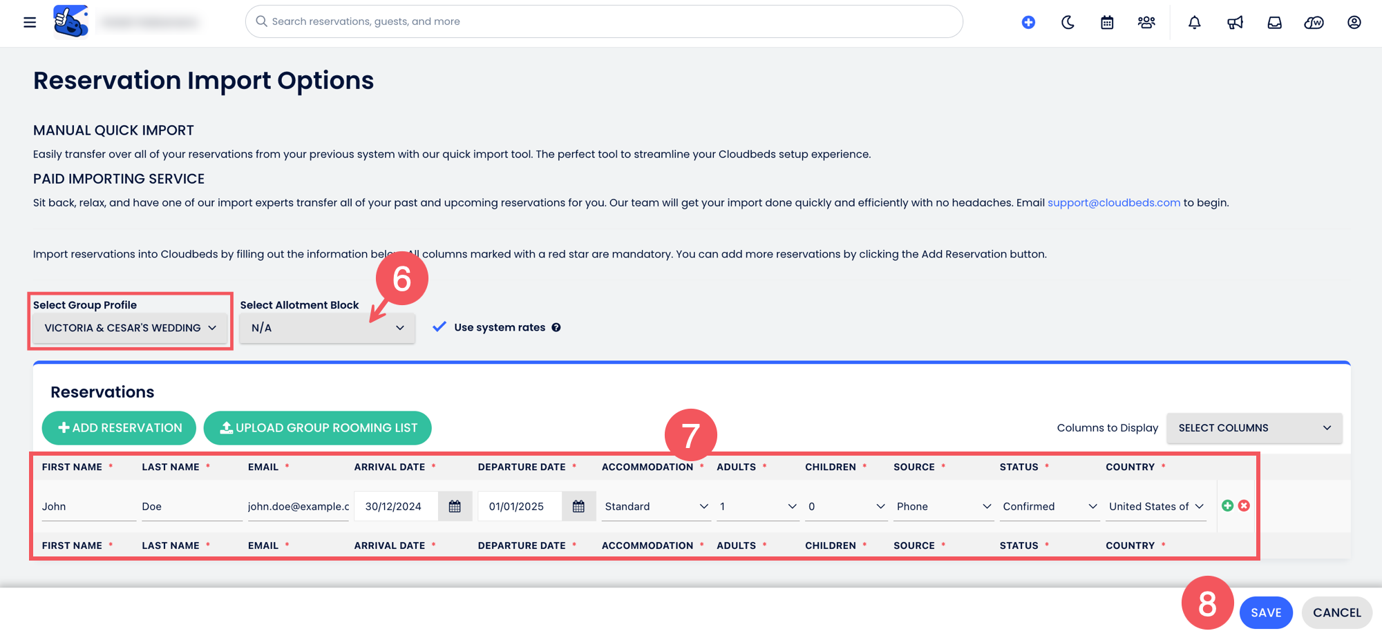 Grup Oda Dağılım Listesi içe aktarma özelliğini kullanırken, Cloudbeds sadece Rezervasyonlar tablosunda şu anda görünen alanları içe aktarır—bu, hem zorunlu hem de isteğe bağlı alanları kapsar.