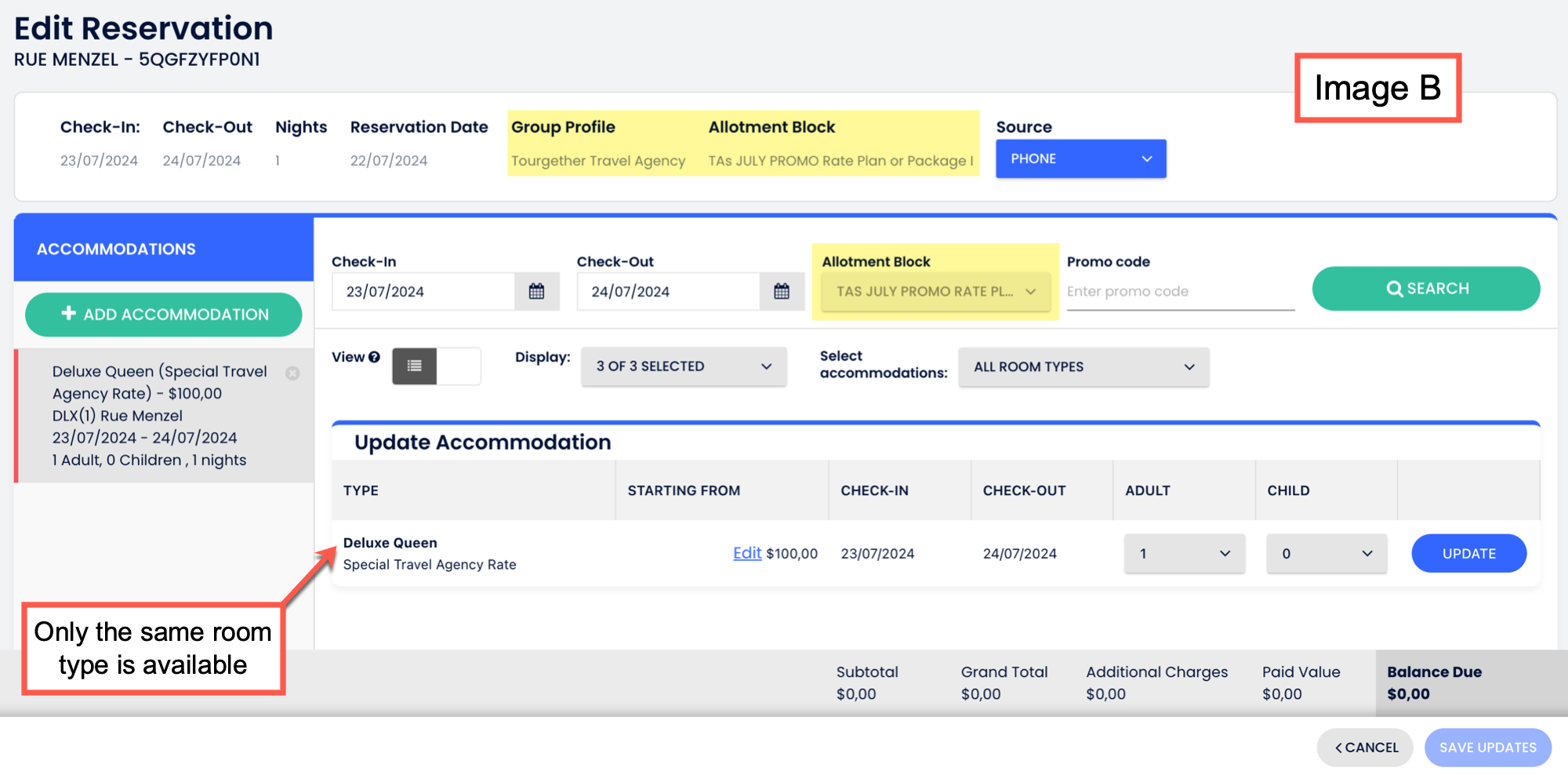 Düzenleme seçeneği, oda tipini değiştirmek istediğinde çalışmaz. Sistem, tüm müsait oda kategorilerini (A görseli) göstermek yerine, sadece Atama Bloğu içinde yer alan Konaklama Türlerini gösterir, eğer varsa (B görseli).