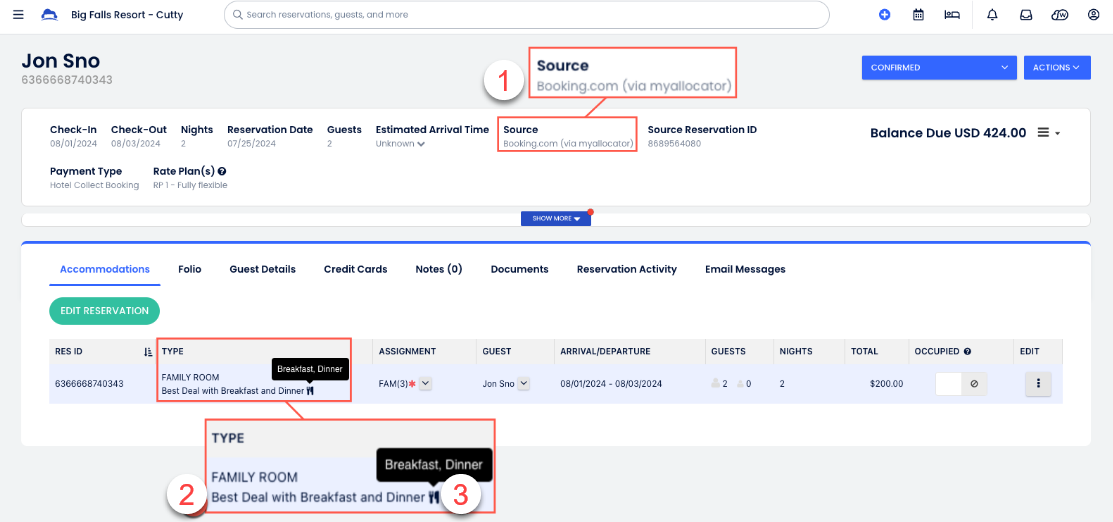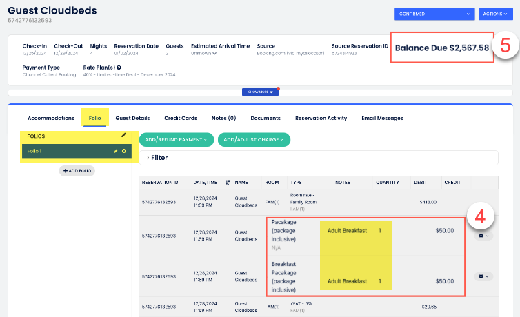 - Kanal rezervasyonları için ek hizmet ve yemek planı gelirlerini doğru şekilde göstermek, böylece toplamların Cloudbeds ile kanal iş ortaklarınız arasında eşleşmesini sağlamak için Rezervasyon Folyosunda.