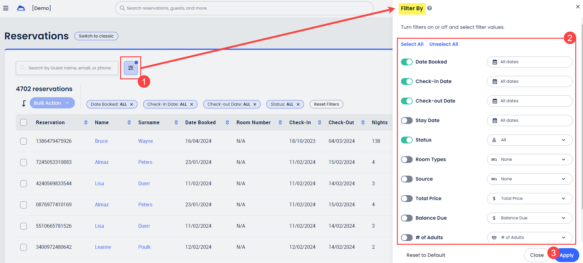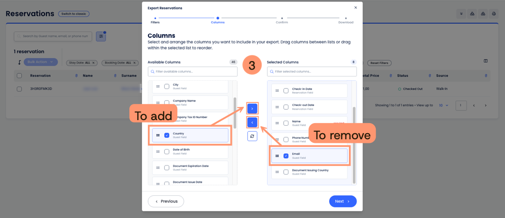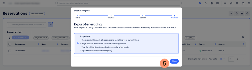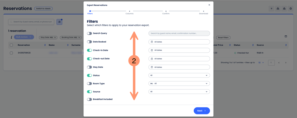 - Dışa aktarım için filtreleri seç (isteğe bağlı). Misafir adı, rezervasyon tarihi, giriş / çıkış tarihleri, konaklama tarihi, durum, oda tipi ve daha fazlasına göre filtreleyebilirsin. Hazır olduğunda İleriye tıkla.