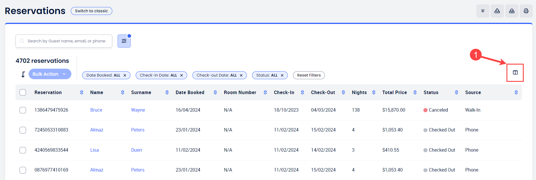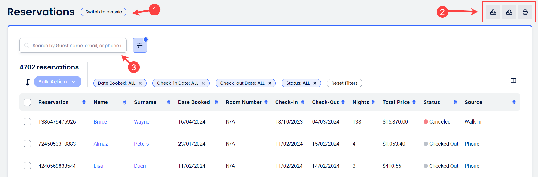 - Arama çubuğu: Ad, soyad, rezervasyon numarası, e-posta veya telefon numarasına göre ara.