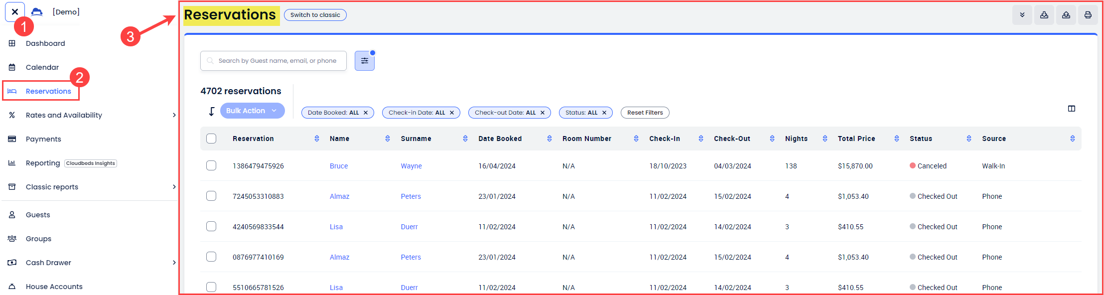 Yeni Rezervasyonlar Sayfası, Cloudbeds PMS kullanıcılarına özel bir gezinme deneyimi sunuyor. Bu sayfa içinde, kullanıcılar ihtiyaçlarına ve tesis gereksinimlerine göre aşağıdaki işlemleri gerçekleştirebilecekler: