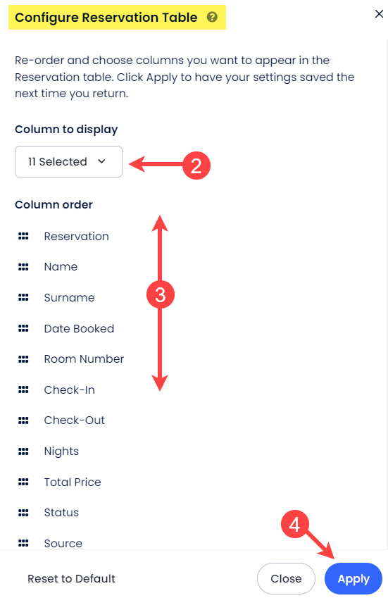 - Rezervasyonlar Sayfası tablosunu sıralayabilir ve yapılandırabilirsin