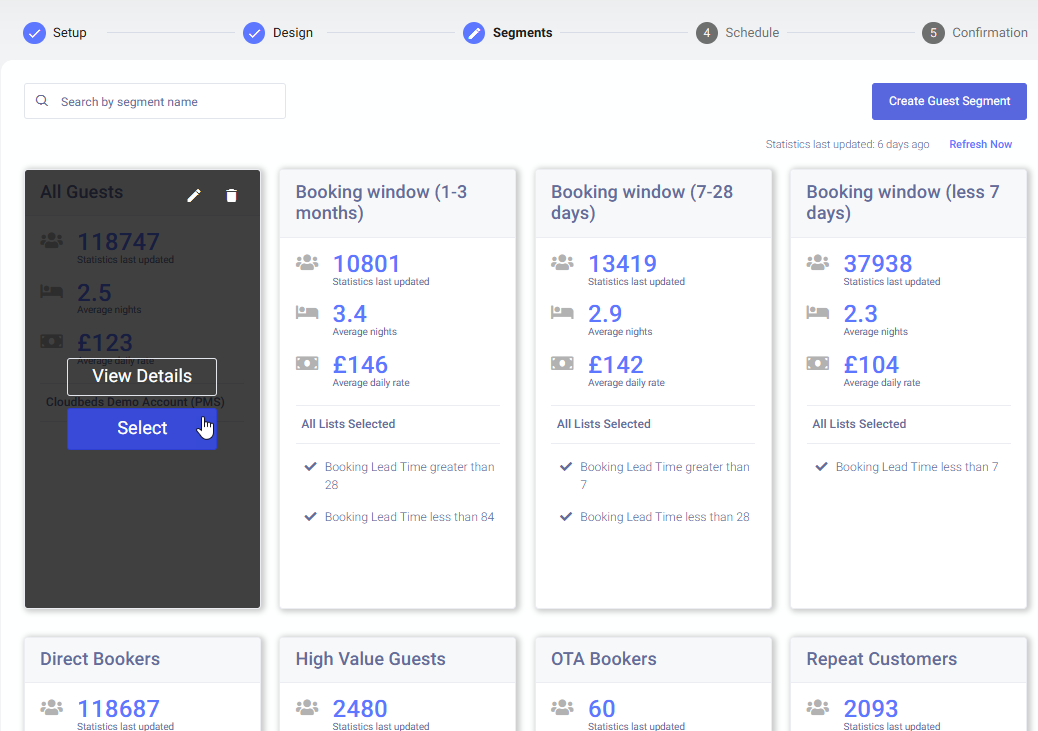 Sonraki adımda, e-postanı alacak misafir segmentini seç. Misafir Segmentleri bölümünde açıklandığı gibi, segmentler oluşturabilir veya düzenleyebilirsin.