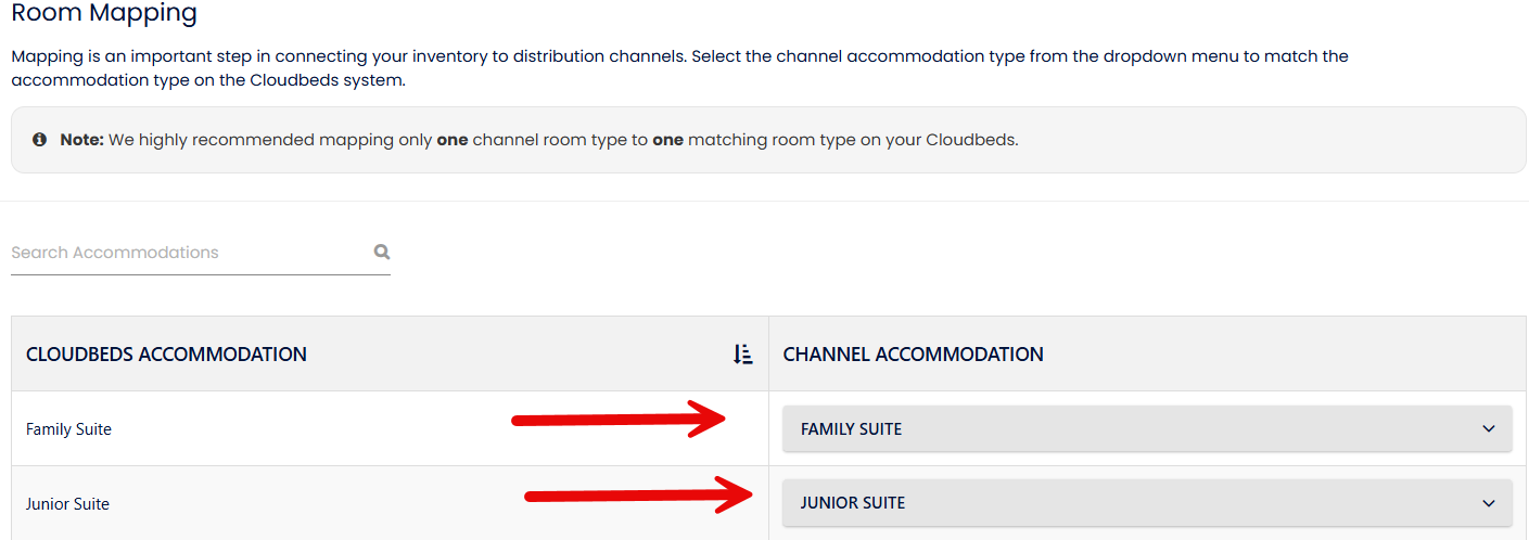 Birden fazla odayı Cloudbeds PMS veya kanaldaki tek bir odaya eşleme. Oda eşleştirme bire bir olmalıdır.