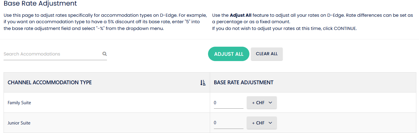 - Her oda tipi için bir Taban fiyat Düzeltmesi ekle (gerekirse). İşin bitince, Devam Et butonuna tıkla veya atlamak istiyorsan sıfırda bırak.