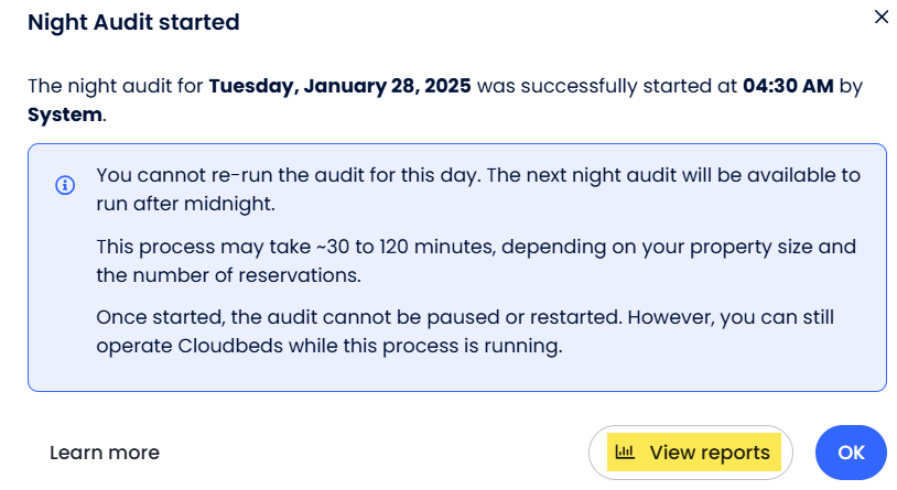 Yukarıdaki mesajdaki Raporları Görüntüle butonuna tıklayarak Gece Denetimi raporlarını görebilirsin. Alternatif olarak, şu talimatları izleyerek manuel olarak da erişebilirsin: Gece denetimi için faydalı raporlar.