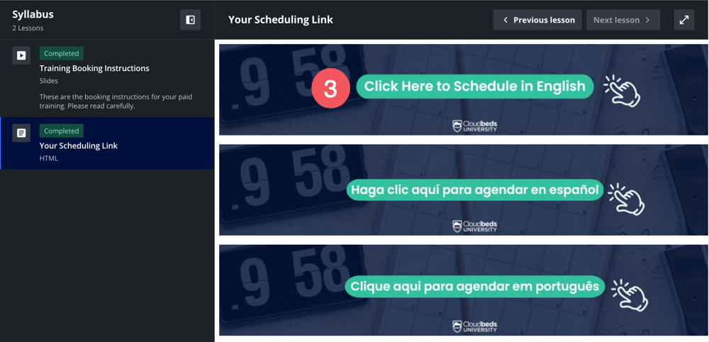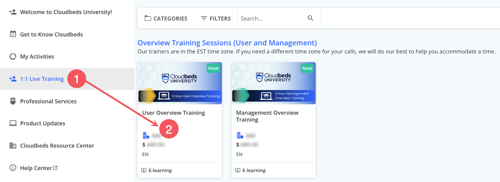 - Cloudbeds University'de, 1:1 Canlı Eğitim (veya Profesyonel Hizmetler) bölümüne git