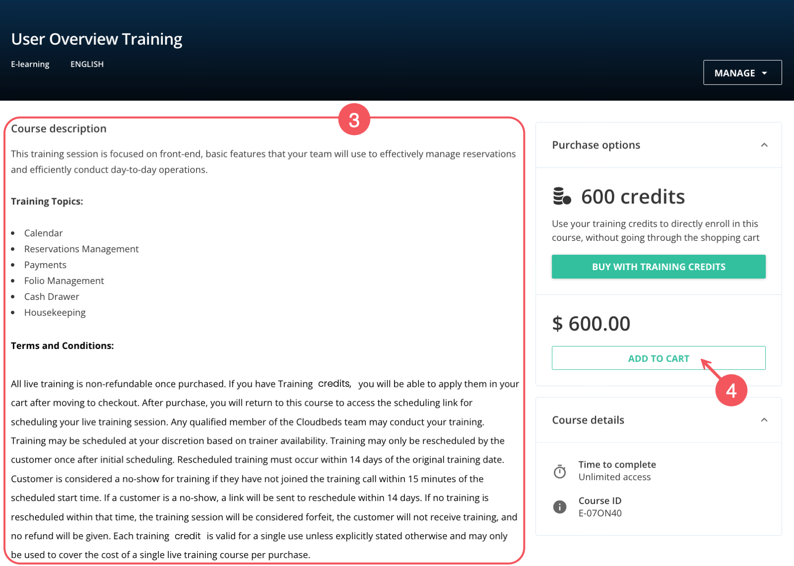 Cloudbeds Üniversitesi kredileri, platformda eğitim, Hizmet veya her ikisinin karışımını satın almak için kullanılabilir. Kredilerini kullanmak veya satın almak için aşağıdaki adımları takip et: