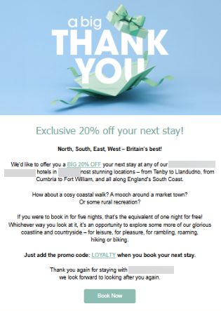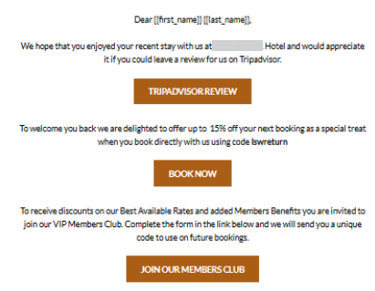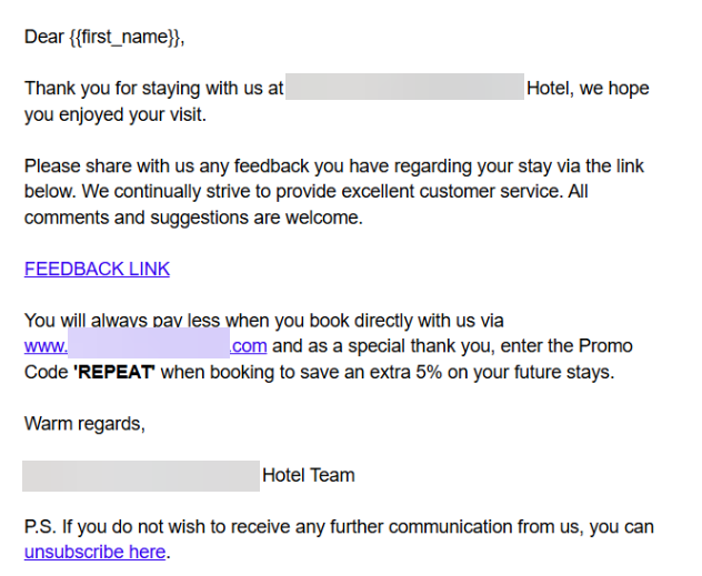 Bu kampanya, çıkıştan 2-3 gün sonra gönderilir; misafirlere konaklamaları için teşekkür eder, geri bildirim toplar ve gelecekteki ziyaretleri teşvik eder.