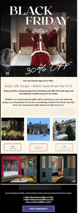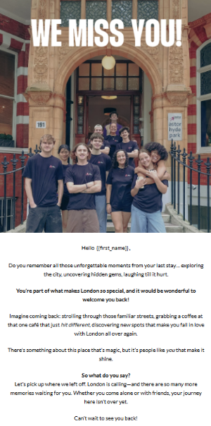 Bu kampanya, bir yıldan uzun süredir geri dönmeyen misafirleri hedefler. İyi hazırlanmış bir e-posta ilgilerini yeniden canlandırabilir ve geri getirebilir.