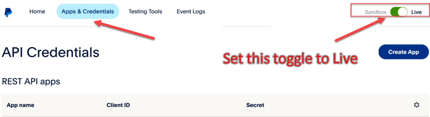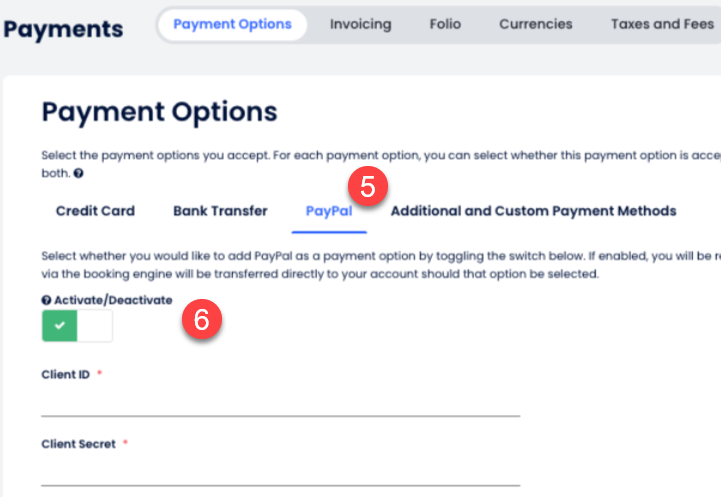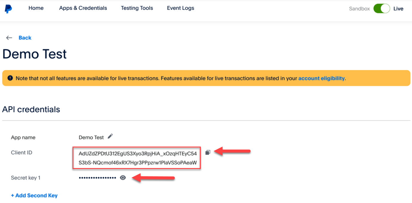 Bu adım gerçek ödemeleri almaya başlamak için çok önemli. Kaçırma ve geçiş düğmesini Canlı olarak ayarla❗ PayPal'dan Sandbox (test) kimlik bilgilerini kullanmaya çalışırsan, Rezervasyon Motorun rezervasyon sürecinde misafire hata mesajı gösterebilir. Bu hatalar, PayPal hesabına geri dönüp Adım 2 ve Adım 4'te belirtildiği gibi Canlı API kimlik bilgileri oluşturup kullandığından emin olman gerektiğini gösterir. Sandbox kimlik bilgileri, canlı Rezervasyon Motorunda gerçek ödemeleri işlemek için kullanılamaz.