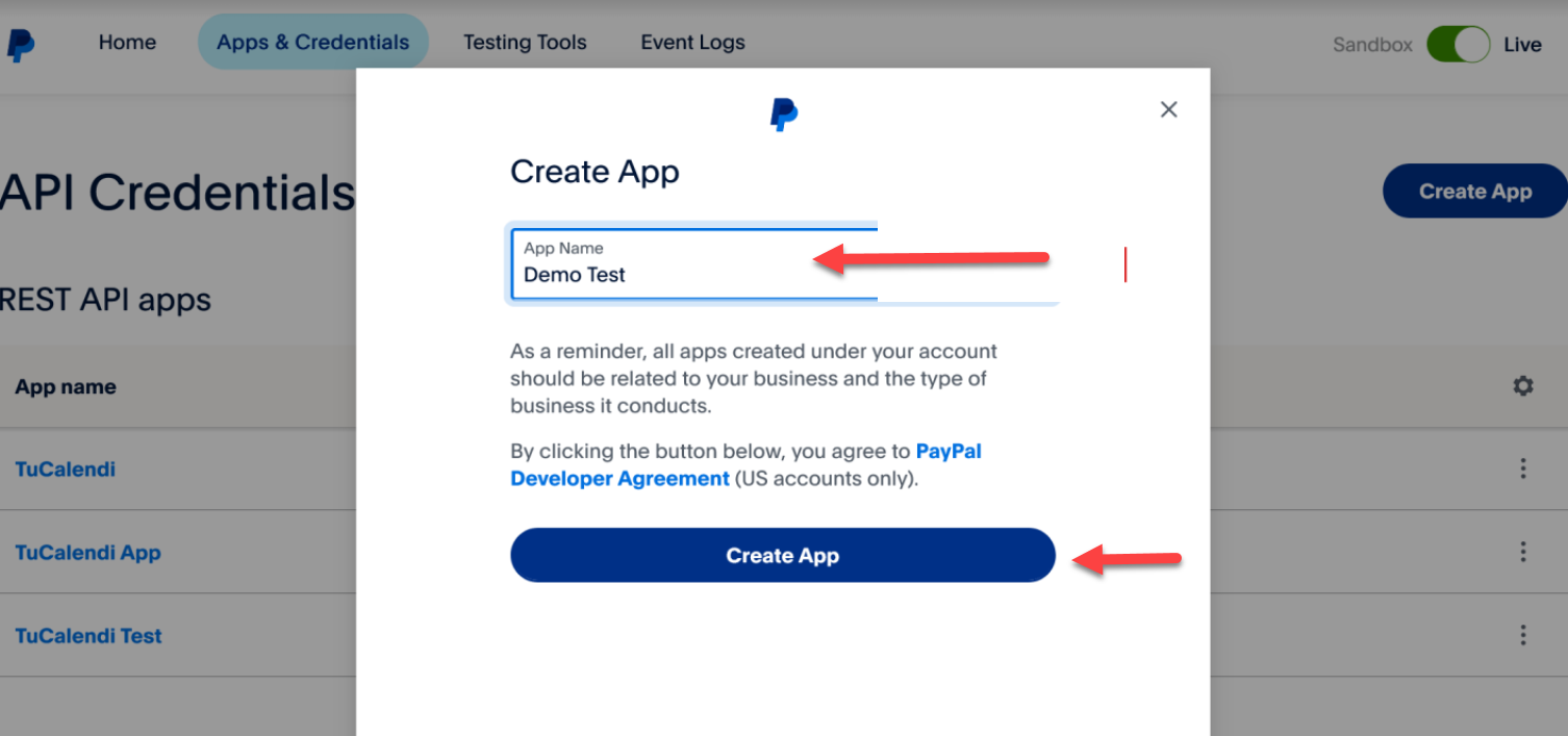 - Bir PayPal Uygulama Adı Ata: Bu bağlantıyı gelecekte kolayca tanımlamana yardımcı olacak bir ad kullanmanı öneririz, örneğin "Cloudbeds Rezervasyon Motoru" veya tesis adın ardından "Cloudbeds".