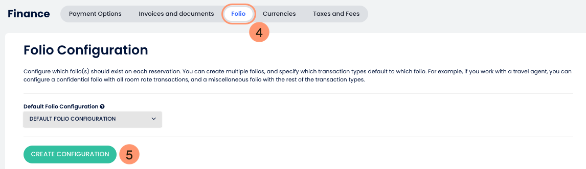 Kullanıcının birden fazla folyo oluşturmak ve her rezervasyon için hangi işlemlerin hangi folyoya işlendiğini belirtmek zorunda kalmaması için, tesisin hangi folyoların hemen oluşturulacağını ve yeni bir rezervasyon alındığında her işlem türünün hangi folyoya işleneceğini ayarlayabileceği bir yapılandırma sayfası ekledik.