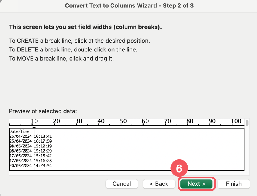Artık veriler ayrı sütunlarda. Aşağıda gösterildiği gibi, onları "Tarih" ve "Saat" olarak yeniden adlandır.