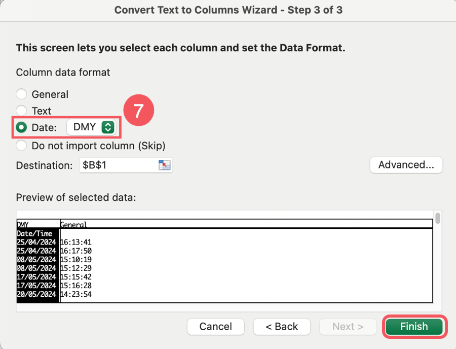 - Tarih - Excel sayfasındaki karşılık gelen sütunu seç