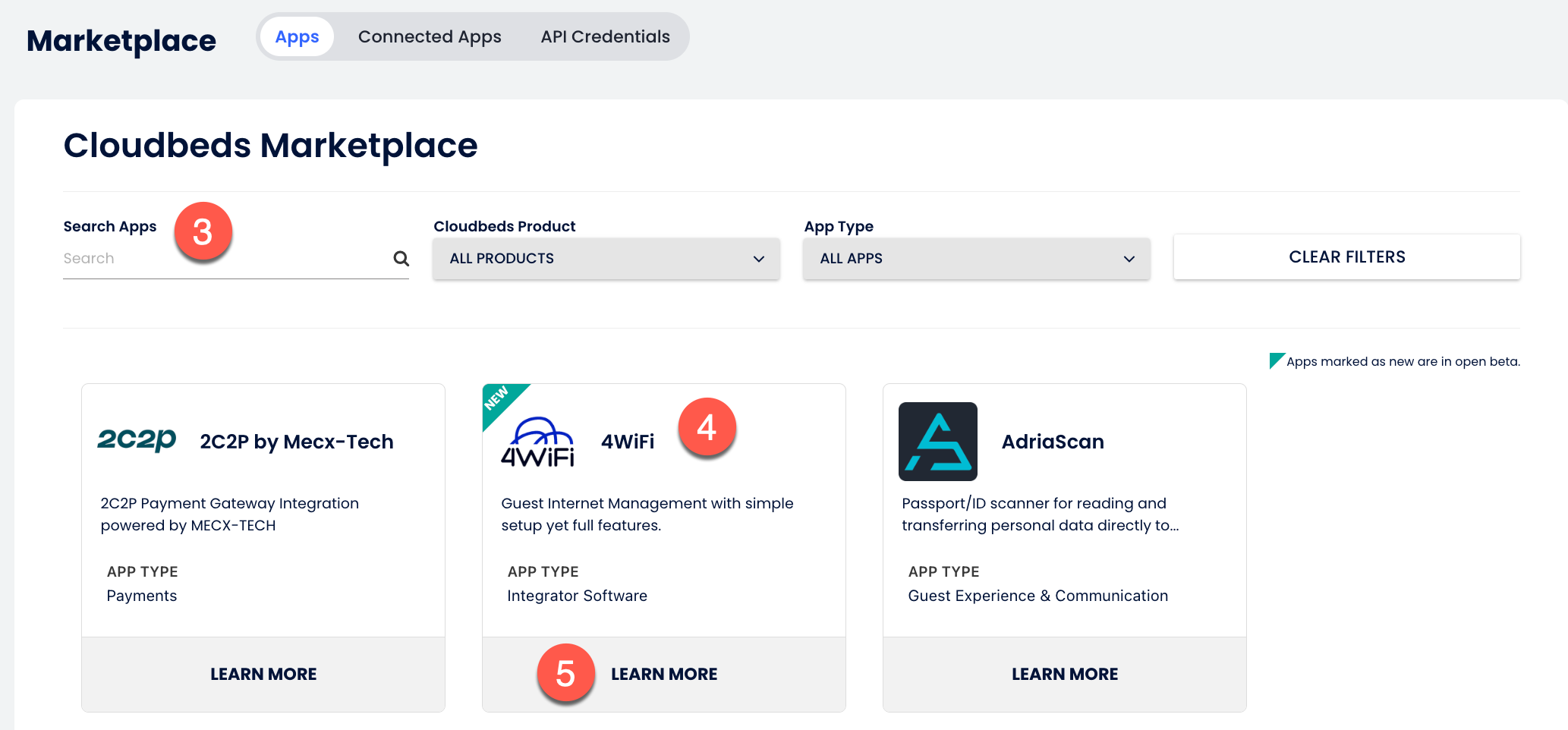 Marketplace, Cloudbeds için en iyi uygulamaları ve entegrasyonları sergiler. Bu sayfada şunları yapabilirsin: