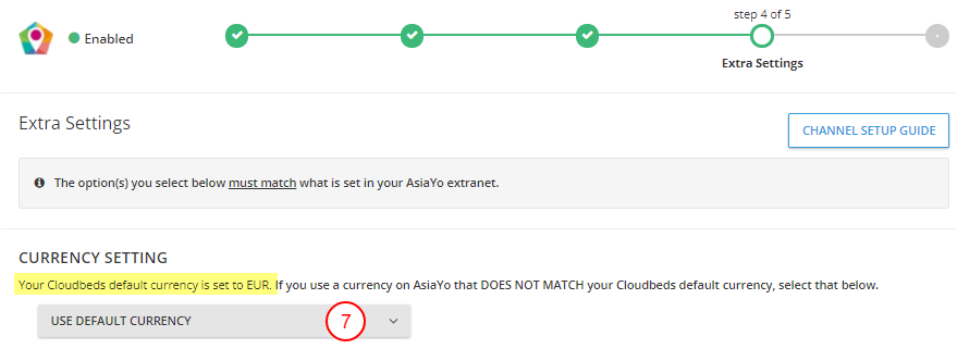 - Ek ayarlar: Para birimi — kanal Cloudbeds varsayılanından farklı bir para birimi kullanıyorsa, doğru para birimini ayarla