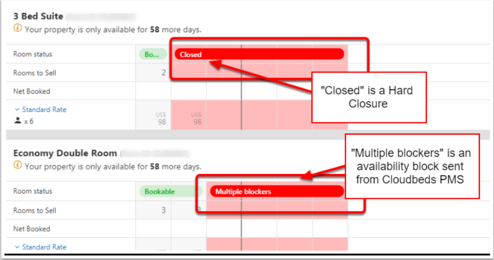 - Çoklu bloklar, Cloudbeds'ten Booking.com'a gönderilen müsaitlik bloklarıdır ve kanal için müsaitlik gönderildiğinde otomatik olarak güncellenir.
