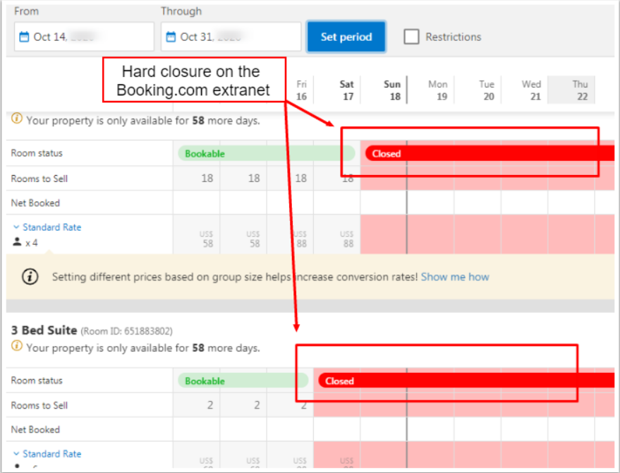 - Kapanış durumu, Booking.com tarafından yapılan sert bir kapanıştır. Bu tür bir kapanışın Cloudbeds PMS tarafından kaldırılması mümkün değildir, yani bu kapanışın doğrudan Booking.com extranetinden aşağıdaki adımları takip ederek kaldırılması gerekir.