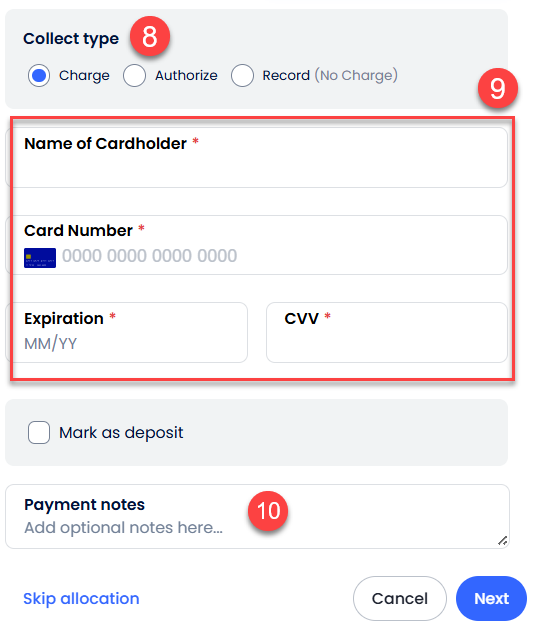 - Kredi kartı bilgilerini gir ve kaydet: Sistemde kayıtlı olmayan bir kartla tahsilat yapıyorsan bu kutuyu işaretle.