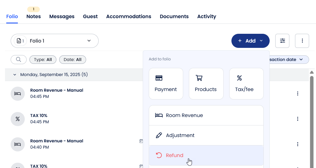 İşlenen ödeme Folyoda görünecektir. Tür alanı, ödemenin ağ geçidi tarafından işlendiğini gösterecektir. Ödeme iadesi için ağ geçidi üzerinden İade seçeneği bulunan bir ayar simgesi olacaktır: