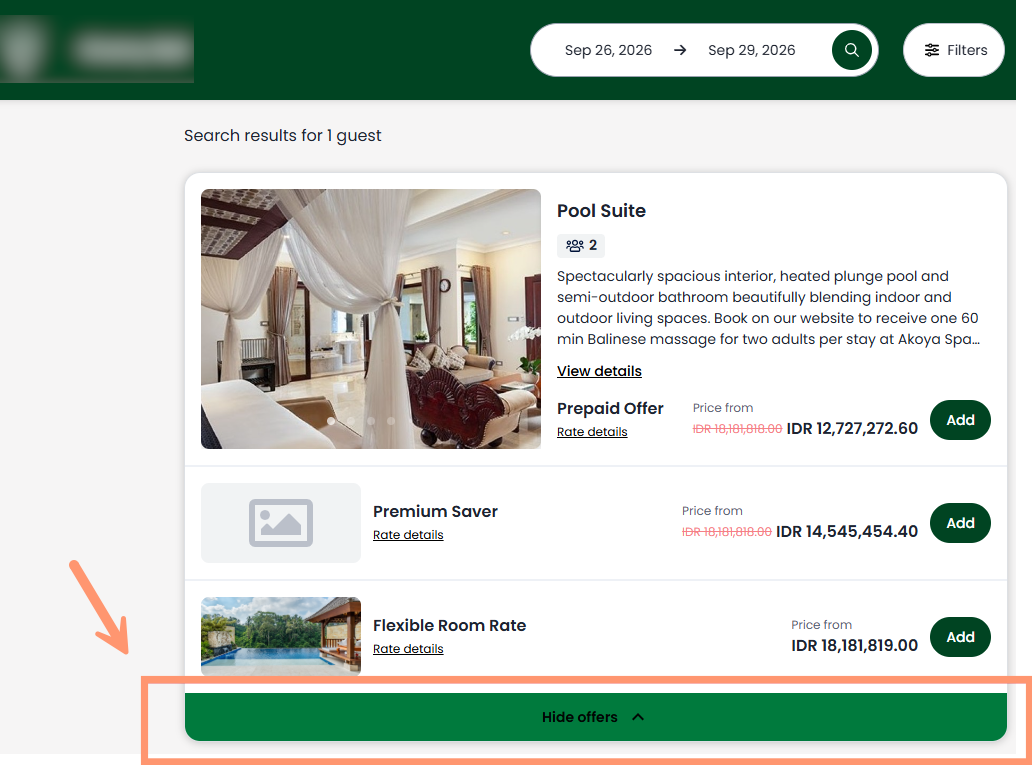 “Teklifleri Görüntüle” ve “Teklifleri Gizle” kasası sadece Cloudbeds Rezervasyon Motoru Plus'ta görünür. Bu kasa, Birincil renknin bir varyasyonunu otomatik olarak kullanır. Bu renk dinamik olarak oluşturulduğu için, Üst Bilgi renginden biraz daha açık veya koyu görünebilir.
