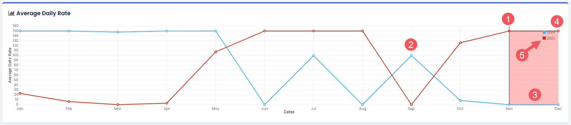 3. Gölgelendirilmiş Alanın alt kısmı, bizim Pace hattı dediğimiz yerdir. Bu çizgi, 15 Ekim itibarıyla Kasım ayı için ADR tahminini gösterir. Bu yılın çizgisi Pace hattının üzerinde veya üzerinde olduğu sürece, geçen yıldan daha iyi performans göstermelisin. Ancak, bu yıl Pace hattının altında ise, geride kalıyor olabileceğin ve yapılacak işler olduğu anlamına gelebilir.