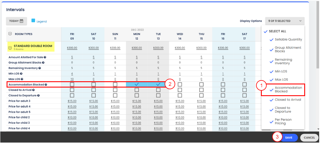 - Müsaitlik Matrisinde, Görüntüleme Seçenekleri menüsünde Konaklama Bloke Edildi seçeneğinin işaretli olduğundan emin ol