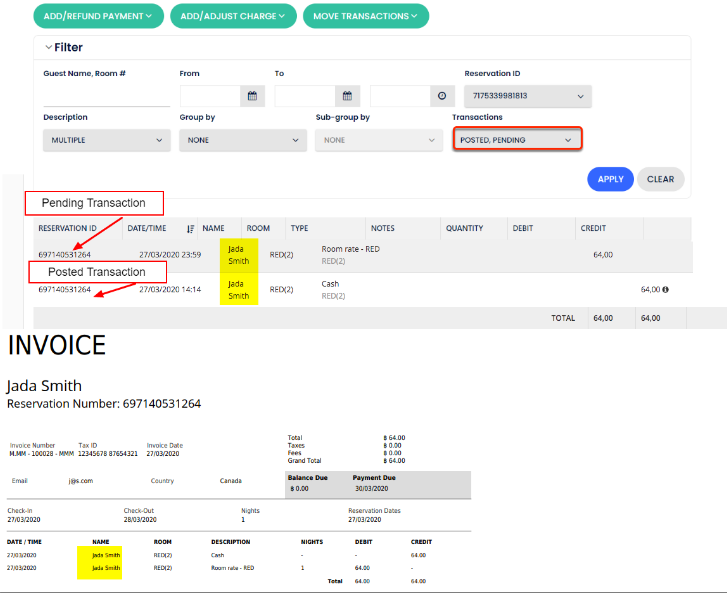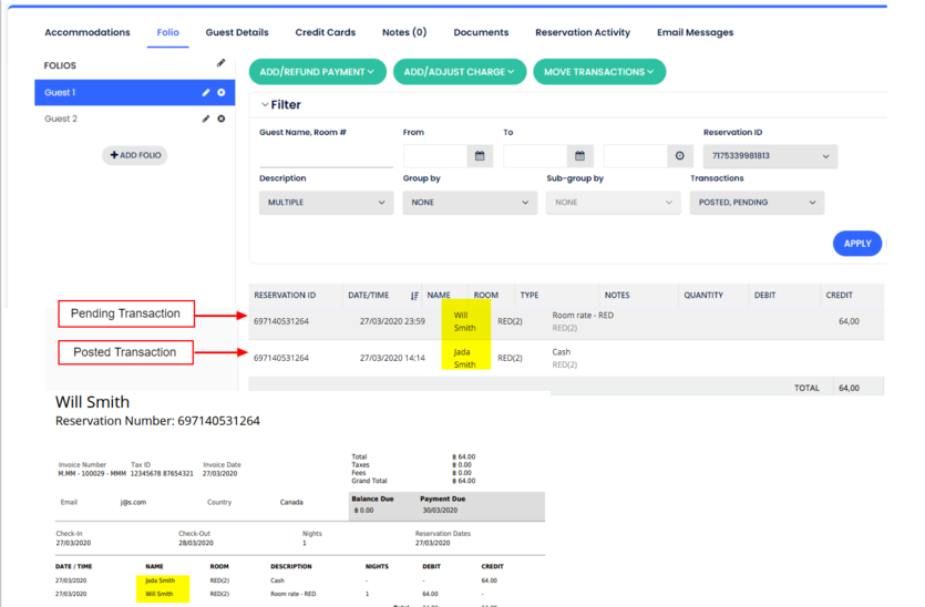 - Misafir adı Will Smith olarak değiştirilmiş olsa bile, başka bir fatura oluşturduğunuzda, daha önce işlenen işlem hala Jada Smith'e ait olacaktır