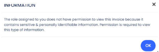 Fatura Kişisel Tanımlanabilir Bilgiler (Hassas ve Kişisel Tanımlanabilir Bilgiler) içeriyorsa, PII görüntüleme izni olmayan bir kullanıcı faturayı görememelidir. Aşağıdaki uyarı mesajı gösterilecektir: