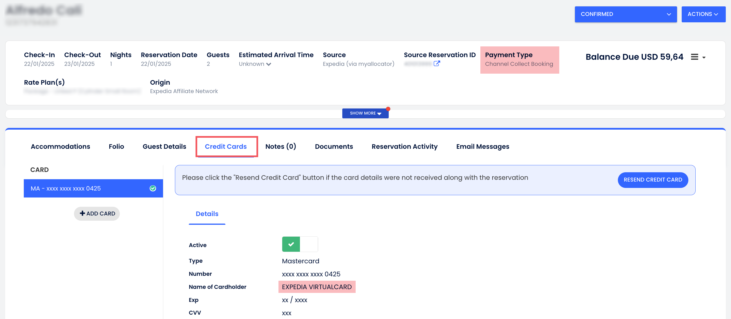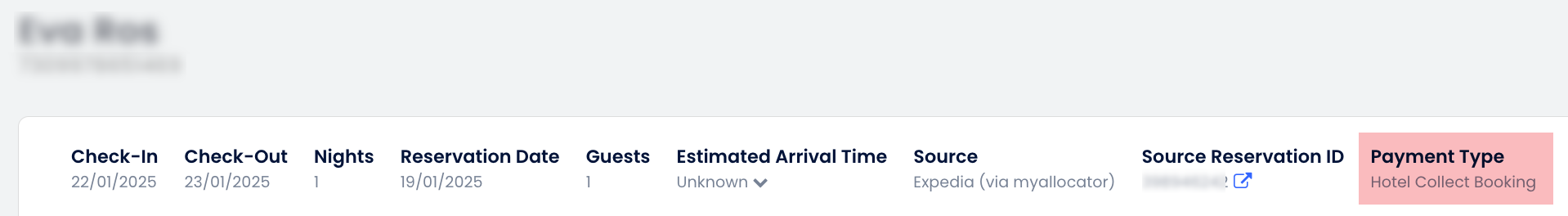 Ödeme yöntemi, Cloudbeds PMS'deki rezervasyon detaylarında her zaman belirtilir, aşağıda gösterildiği gibi: