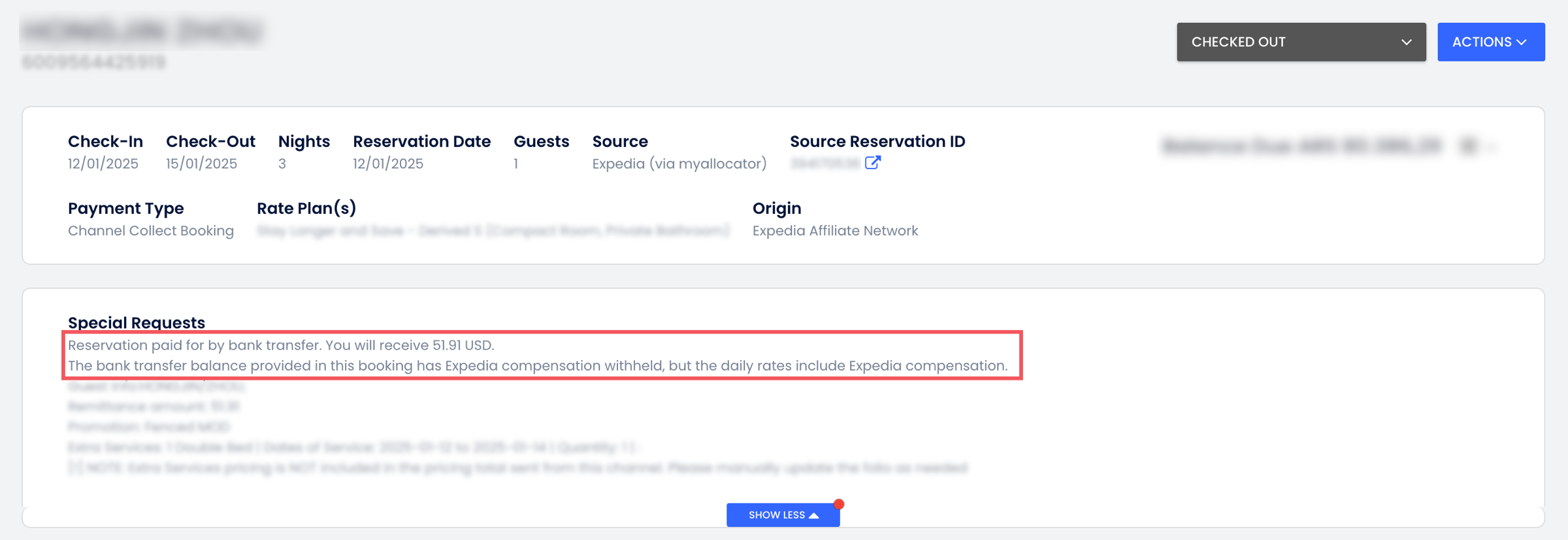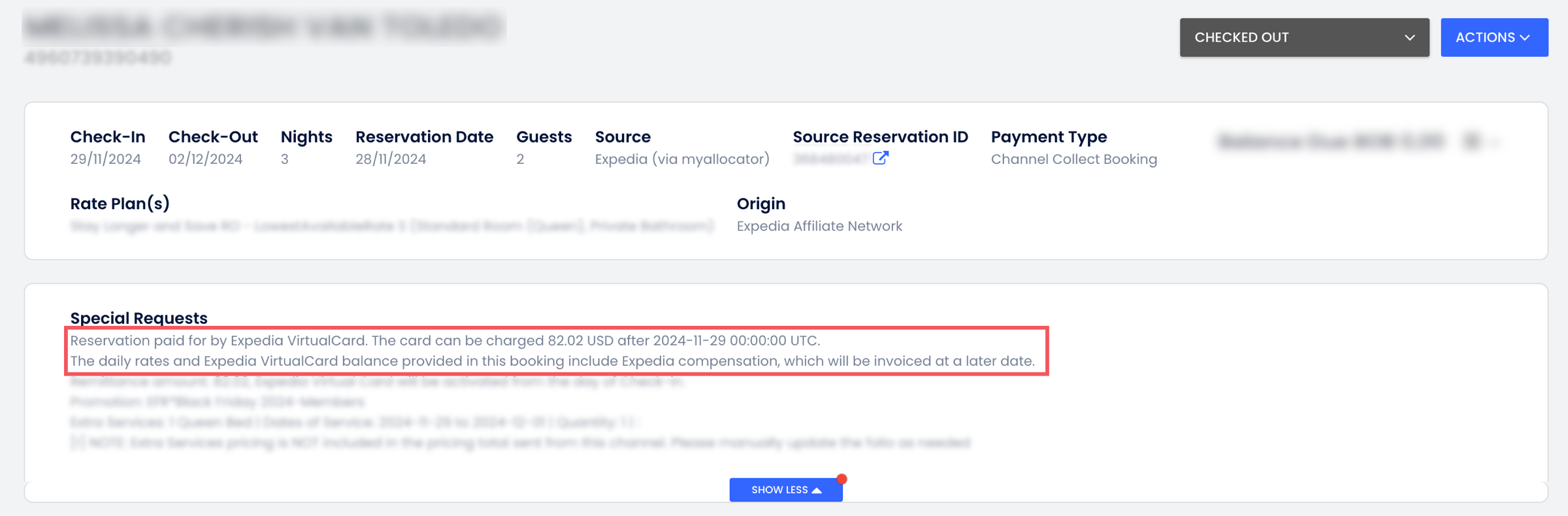Expedia Channel Collect rezervasyonları aldığınızda, her rezervasyon veri yüküne göre Özel İstek alanının altında aşağıdaki mesajlar görüntülenir: