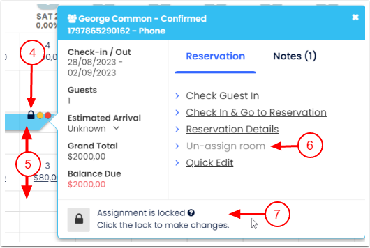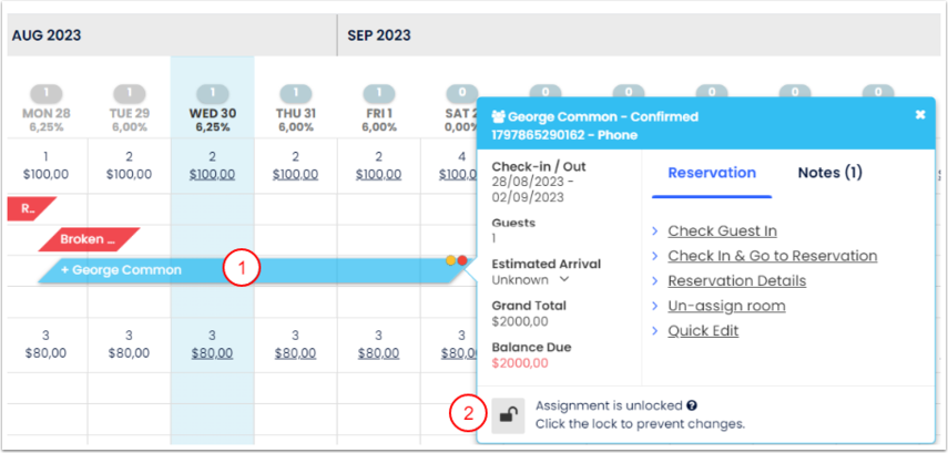 - Takvim atamalarını yalnızca rezervasyon zaten bir oda/yatak atandıysa kilitleyebilir veya kilidini açabilirsin. Otomatik oda ataması etkin değilse, öğrenmek için bu makaleye bak: Atanmamış bir rezervasyona nasıl oda atanır.